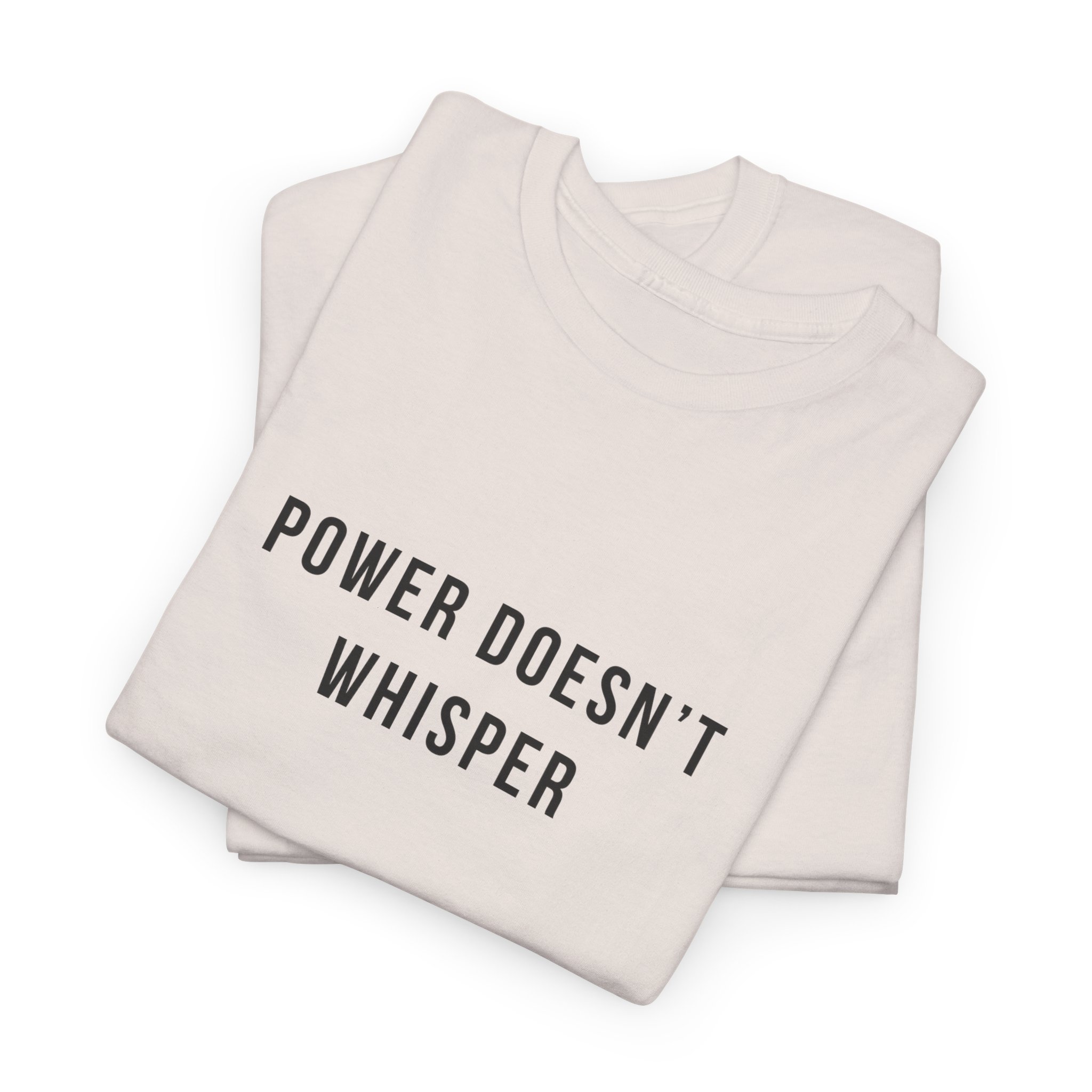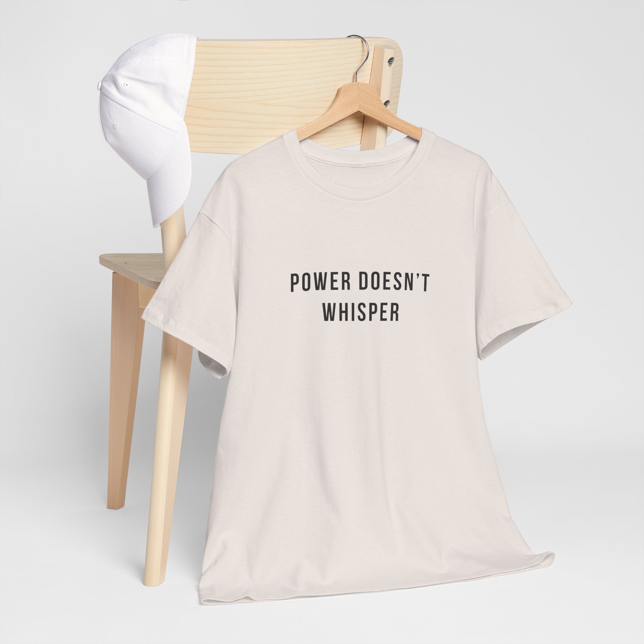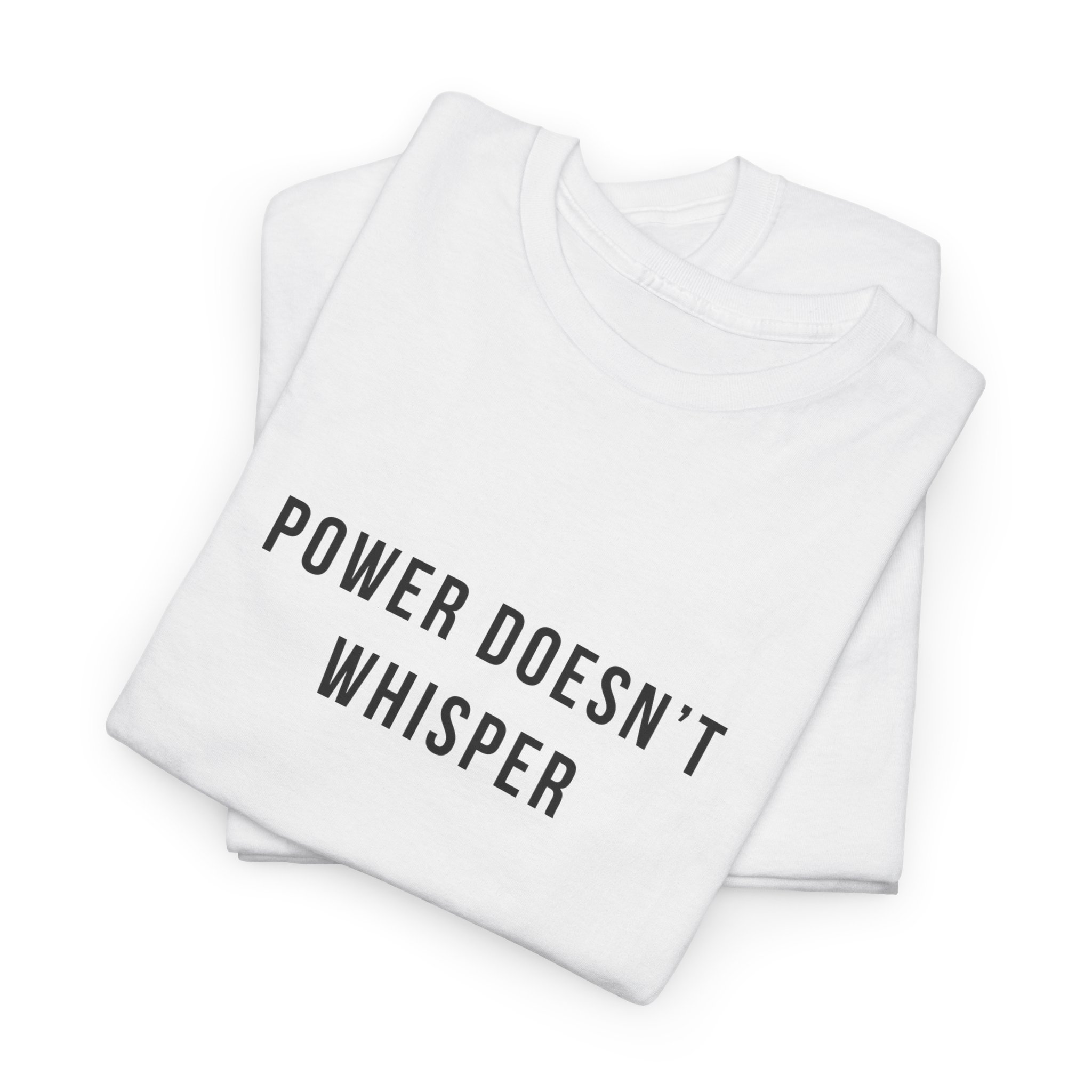 Power doesn’t whisper t shirt with a minimalist, text-only design